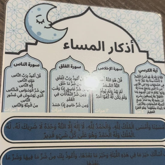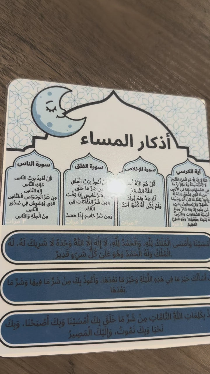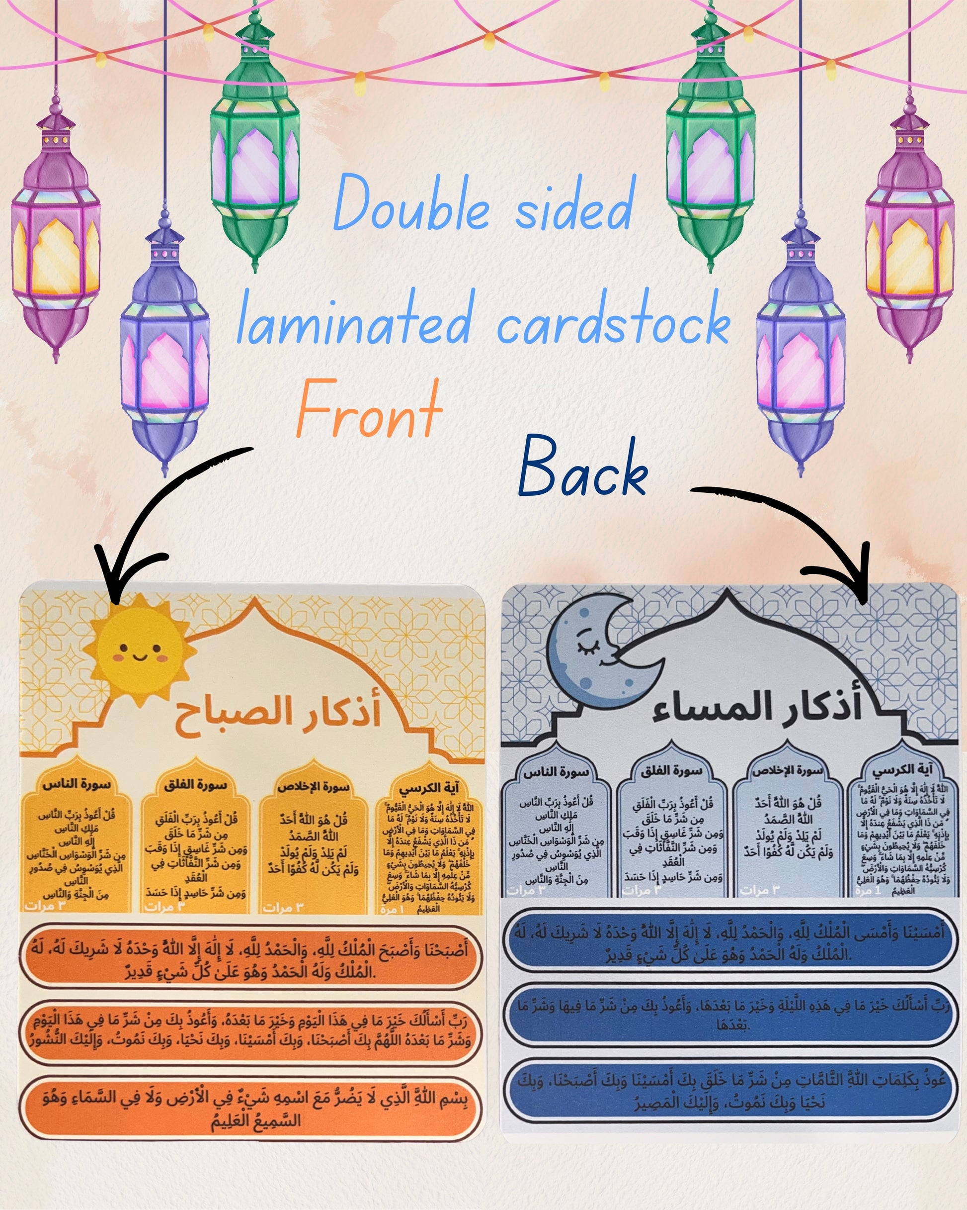 A double-sided laminated Adhkar card with Morning and Evening Adhkar, made to last.